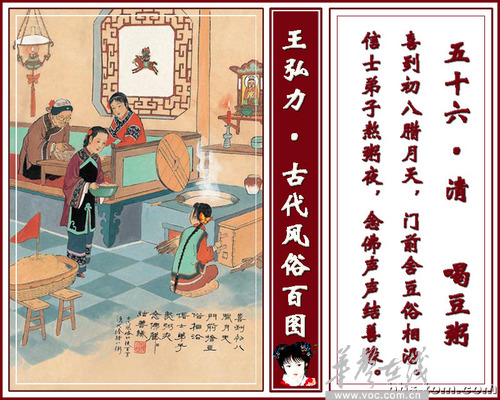 也许是佛教弟子们为了纪念那位好心肠的牧牛姑娘吧,每到了这一天,各个寺院的和尚们就要熬上一大锅放了各种杂果各种杂粮的粥,先敬佛,再给附近的穷苦百姓施舍些。给有钱人家送粥的碗里还放好自家的庙号,有钱人就会差人把包好了写着“回敬”的银两送回。在《梦梁录》里是这样记载的:“十二月八日,寺院谓之腊八,各寺俱设五味粥,名曰:腊八粥,亦名佛粥。”到后来佛教入土中原,这一习俗也渐渐地流传到了民间。老百姓们在腊八这天熬粥敬佛外,还用它来做馈赠亲朋好友的礼物。
