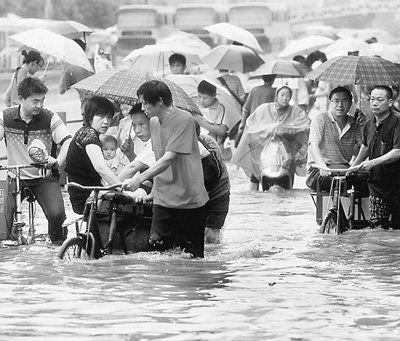 持续多日的强降雨天气,湖北省武汉市城区许多道路被淹,部分路段完全中断车辆通行,市民只能涉水冒险通行。