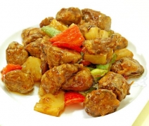 原料:紫茄子、菠萝、青椒、红椒、番茄酱、白醋、橙汁、糖。