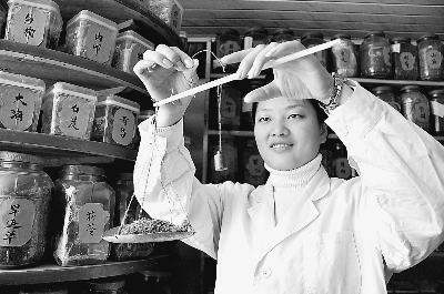有了药方,就要到药店去抓药。在药店里,你可以看到司药人员把处方放在柜台上,手里拿着戥子,到身后的药柜上一个格子一个格子的小抽屉里去抓药。如果是位老药工,他一看是几克,在小格里用手一撮,用戥子一量,准是几克。人常说熟能生巧,这种过硬本领是靠成年累月的抓药实践练出来的。新药工抓药,就达不到这样的水平了。