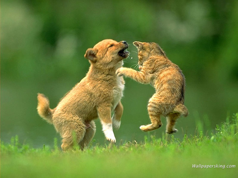 在德国汉堡大学的动物学家哈拉尔德·施利曼眼里,这对冤家其实没什么不共戴天之仇,它们只是情感表达不同,沟通不畅罢了。比如狗摆动尾巴是表示友好,而在猫的认识中这个动作意味着“别惹我,滚开”!相反,猫把尾巴挑起来是表示友好,在狗的语言里却是一种挑衅。