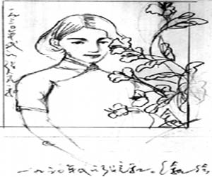 张充和的继母韦均一工书画,擅昆曲,年长充和十五岁,两人常在一起练习唱曲、绘画。一次,继母兴起,在《曲人鸿爪》页里,画了一幅“充和吹笛”侍女图。那是一幅速写。画美人嘴唇时,客人正到,仓促间笔头失控,樱唇就成了一个红点。