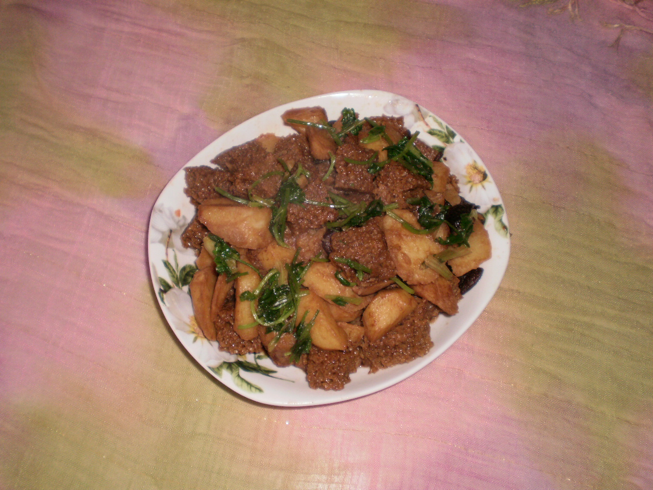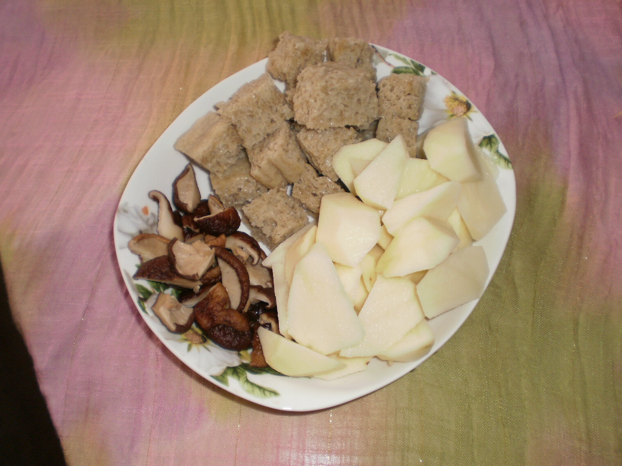 原料:土豆2-3个;香菇几朵(根据自己的喜好可多放可少放),烤麸一块;油250克。