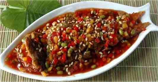 4、炒锅内放油、加入葱、姜、松子、豆瓣酱,爆出香味,随后放入水发香菇丁、素火腿丁、素肉丁、冬笋丁、青豆、红辣椒丁炒熟,倒入素高汤、撒入食盐,味精,胡椒粉,加入番茄酱、白糖、白醋,淋入湿淀粉拌匀成芡,出锅浇在素鱼上,再加入麻油,即成。