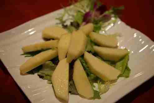 做法:1、蔬菜洗净切小段垫盘底、苹果去皮切块后置菜上。