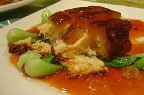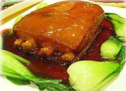 5、锅底放小竹镂空筛板、(以免冬瓜沾锅底)再把冬瓜靠皮面朝下放竹筛板上,倒入事先做好卤汁(要浸没冬瓜),小火焖烧15分钟以上、使素东坡肉入味着色后装盘,再淋上少许卤汁即可。