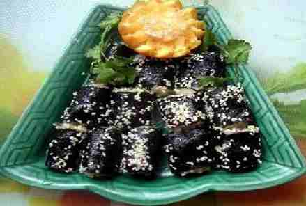 2、紫菜摊平,铺上馅料,卷成筒状,蒸几分钟,冷却后改刀装盘装饰。