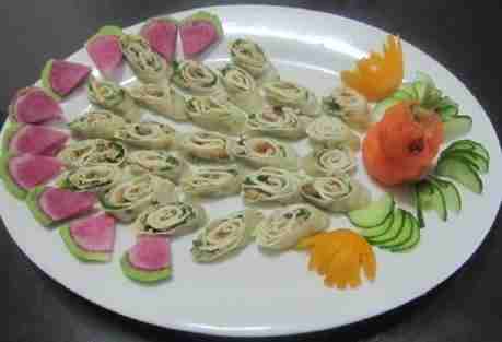 3、把香菜茎用红椒裹成小束、装饰盘两边。