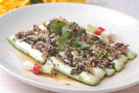 2、把橄榄菜、素腊肠肉末均匀铺在丝瓜上,大火隔水蒸10分钟取出,撒上香菜即叶可。