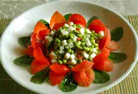 原料:大西红柿一个、小青菜、毛豆,茭白,红辣椒,淀粉、植物油、盐、蘑菇精、适量。