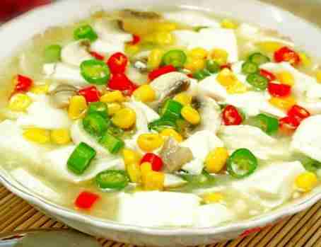 原料: 韩国泡菜、内脂豆腐、蘑菇、素虾仁、青、红椒、美国甜玉米粒