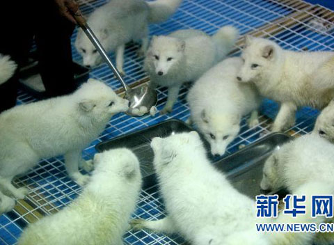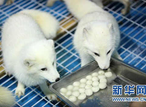 2月17日,北极狐争食工作人员送上的“元宵”。(新华社 王振武/摄)