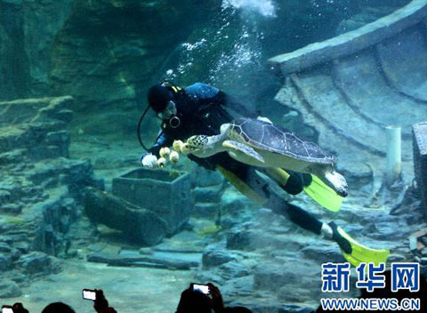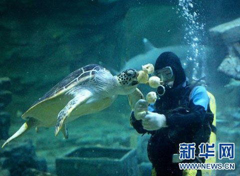2月17日,潜水员在给海龟喂食特制的“苹果元宵”。(新华社 王振武/摄)