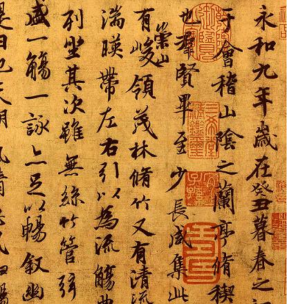 贞观二十三年(649),唐太宗在弥留之际嘱李治(唐高宗)将《兰亭序》陪葬昭陵。“天下第一行书”就这样永绝人间了。今天,我们所能见到的不过是唐人的摹本。墨迹摹本以冯承素的响拓(双钩填墨)本为最。因此本上鉴有唐中宗“神龙”小印,故称“神龙本”。刻本则以宋定武太守薛珦所刻为佳,是为“定武本”。