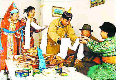 蒙古族——除夕更岁时,一家人围坐在包内火炉边,在向长辈敬献“辞岁酒”之后,饱餐烤羊腿和煮水饺。