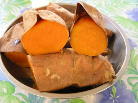 顺便告诉大家选红薯的小窍门:在市场或超市买红薯时要选个头椭圆形,皮红的这样的红薯甜而且里面比较红。千万不要选那种圆的或者奇形的红薯,不好吃不说,里面还有筋,另外表皮带白色的红薯也不要挑,这样的红薯味淡,芯不红。