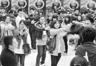 行为艺术表演中,100人以手指作枪,为保卫地球上最后一缕生机而“生死相搏”。记者 陈大祥 摄