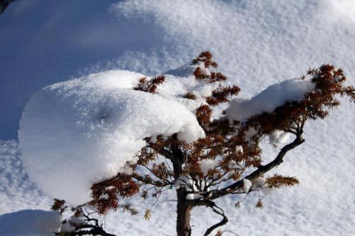 枯木没有选择地接受这顶白色的雪帽,和手套,享受着大自然赋予的关怀和美容。