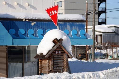 汽车走在雪地上,响起吱吱声,好似雪在重压下也会痛。垃圾站中的垃圾摆放有序分类清楚,那红色的垃圾房前的雪路平平展展。街上随处可见的砂箱,用来提供在冰雪中沦陷的司机增加轮子摩擦里的沙子。