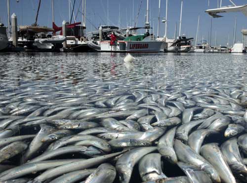 美国当地时间3月8日,加州洛杉矶以南的海湾区突然出现数百万条死鱼,包括凤尾鱼、鲭鱼、沙丁鱼和其它小鱼。当地一名警方发言人说,死鱼大约有一英尺那么深,国王码头(King Harbor Marina)几十条私人船只周围到处是死鱼。