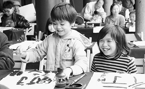 参加者多是儿童的还有“书福道”。除了教写书法,“书福道”的老师每天也会教一句《论语》,何正一那天教的是“巧言令色”。写着“行善”两个字,何正一不忘顺便教导小朋友:“长大了赚到钱,不要只放在自己口袋里,也要给那些需要帮助的人。”孩子们可能听到,也可能没听到,仍在纵兴挥毫,一双双小手写得无拘无束。