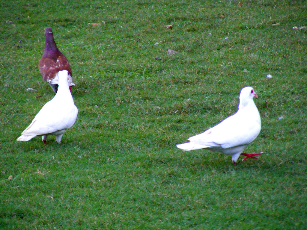 我举起相机给它拍照,它也不惊不恼的,一会儿飞上屋檐,一会儿飘回大地,一会儿在你面前逛来逛去,一会儿又跟在你后面“邯郸学步”,逗趣得很。它真象一个得道者,自在,无忧,外界几乎干扰不了它宁静的心。喜群居的鸽子,竟有如此定力,真是不可思议!