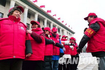 魏大叔在天安门西侧执勤。当笔者问做义工有什么感受时,魏大叔不好意思地说:“我的工作就是协助民警维持秩序,其实也没做什么值得一提的大事,也就是利用空闲时间尽己所能,帮助居民游客一些琐碎的小事,像问路什么的,半天下来有20多个人。”谈到对两会的期望,他说:“其实现在很知足,老百姓图的不就是丰衣足食么。”
