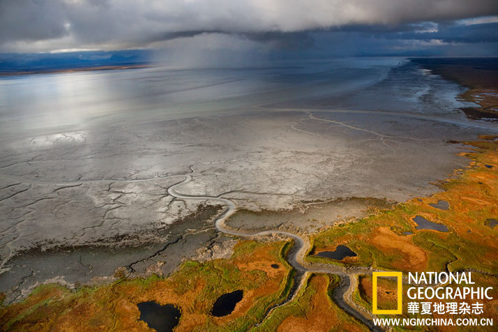 “分水岭”这个词不会有比用在这里更贴切的场合了。放眼望去,在这块土地的每一个方向,水把万物结合在了一起。方圆10万平方公里的区域内,数十条支流汇成了九条主河道,这些支流有的像笔直僵硬的树枝,有的又像蜿蜒的血脉。这里有许多奇形怪状的水塘,叫人不禁想起西班牙画家米罗的油画,巨大的“画布”远远伸向地平线。大多数地方,地下水位接近地表,水流渗出或形成涌泉,不断为海绵般的冻土补给水分。这真是一个润泽的地方。
