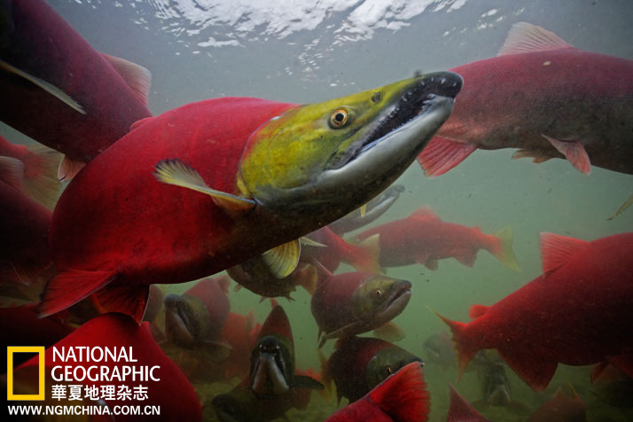 我们接近目的地,也就是这片异常原始而物产丰饶的地区眼下窘况的核心所在了。“是这儿了,”哈尔福德说,“就是水朝着三个方向分流的那个位置。”从伊利亚姆纳湖北边这片广阔的丘陵地区,楚利特纳河向东流入克拉克湖,周边一带就是克拉克湖国家公园及保留地。考科图利河的南、北岔流向西北蜿蜒,汇入姆尔查特纳河,姆尔查特纳河又流进努沙加克河,而上塔拉里克溪向南奔腾直至进入伊利亚姆纳湖,伊利亚姆纳湖则泻入克维查克河,克维查克河也跟努沙加克河一样,最终会抵达布里斯托尔湾。每年夏天有几个星期的时间,3000万到4000万只成年红鲑会回到这个海湾。在一种古老的迫切欲望驱使下,它们在这些河道的浅水中逆流而上,到源头产卵、死亡,让自己的物种延续下去。