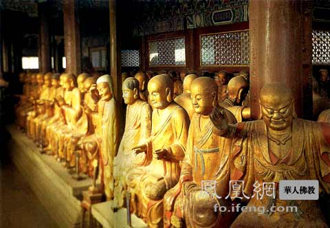 一些较大的寺庙多塑有五百罗汉像,一般分两殿供奉。他们或坐或立,或俯或倚,嬉笑怒瞋,神态各异。有的帽履整洁,有的衣衫潦倒。他们慈眉善目,妙相庄严;也有怪诞狰狞,动作诡异的;有伸足屈膝,打坐箕踞的;有拄杖持珠,合十摊手的;有矫揉作态,念念有词的;有闭目凝思,参禅入定的,真是千姿百态,各呈其趣。