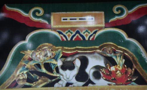 日本人爱猫,在东照宫也能体现。在阳明门和中国唐门之间,有一个被称为“神龛首要建筑”,在它的门楣上有个“睡猫”。要看这只著名的睡猫你得花上几个小钱才能进入。在进入侧边敞开式的红漆走廊后,沿着一直通向陡峭的小山坡走,小山坡顶上就是真正的德川陵墓了。“睡猫”这个涂漆浮雕,便在入口门上面。这个灰色的小猫浮雕,雕刻得相当精巧可爱。却不那么引人注目,据说它是安静的象征。它已入睡表明所有的“危害之鼠”已经被清除掉了,所以神龛是安全的。
