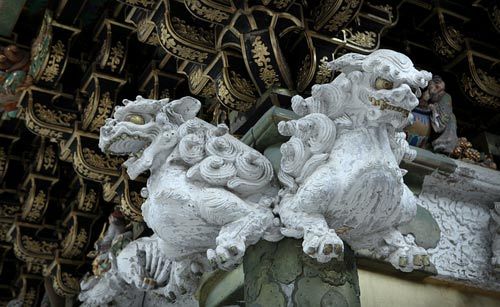 其实整个二社一寺共有42座建筑,其中29座装饰有各种风格的雕刻图案,这些图案共有5147种样式。从日本艺术史的重要性上来看,阳明门的确很著名。大门的每一面几乎都装饰了精美绝伦的雕刻图案,有玩耍的儿童、云彩、牡丹、松木、翠竹;以及日本杏树、凤凰、仙鹤、野鸭;还有瀑布、乌龟、大象、野兔等等;另有一对有皮毛的猛虎、中国狮子以及象征王权的传统标志——龙。