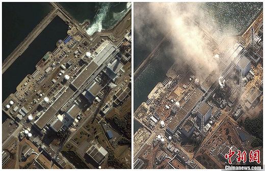 日本政府表示,当地时间15日晨6时10分左右,福岛第一核电站2号反应堆附近传来爆炸声。早些时候的报道指出,福岛第一核电站2号反应堆容器出现部分破损,这表明可能导致更为严重的核泄漏。图为福岛第一核电站爆炸前(左)后(右)对比图。