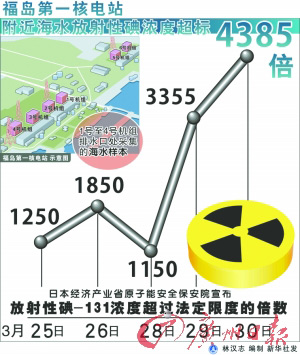 东京电力公司说,3月29日从同一地点采集的海水样本的放射性物质浓度超过法定限度3355倍,如今这一数值再次被刷新。