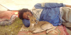 生活在青海小泊湖湿地的南加是一位普通的藏族牧民,在家乡从事生态保护工作已近20年。近年来,他共救助、收养了6只普氏原羚和3只藏原羚。在他的影响下,家人也和这些美丽的野生动物产生了深厚的感情。2009年7月,南加收养了一只刚刚出生,妈妈被狼吃掉的普氏原羚幼仔。为了养好这个小家伙,他自费购买数只山羊为小普氏原羚喂奶。他的3个孩子更是每天争着给小羚喂食,晚上抱着它睡觉。从事生态保护工作以来,家境并不富裕的南加已自费投入近20万元。在南加的带动下,附近的牧户们自发组成16人的监测巡护队,参与保护普氏原羚和黑颈鹤等工作。