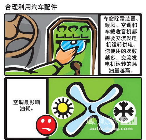 七、合理利用汽车配件:车窗除霜装置、暖风、空调和车载收音机都需要交流发电机运转供电。使用的次数越多,交流发电机运转的耗油量越高,空调最影响油耗。