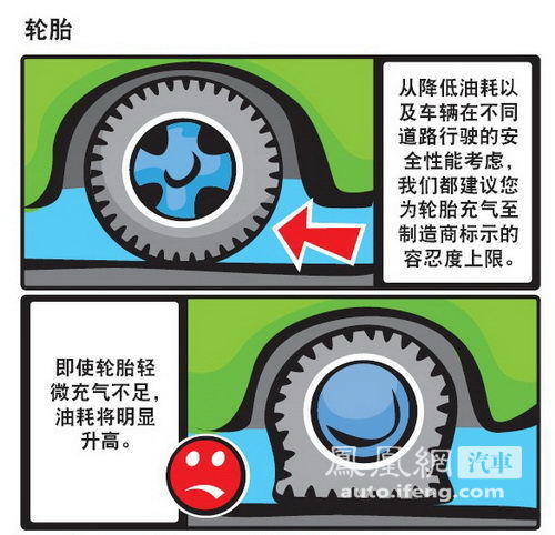八、轮胎使用:从降低油耗以及车辆在不同道路行驶的安全性能考虑,建议您为轮胎充气至制造商标示的数值上限。即使轮胎轻微充气不足,油耗也将明显升高。
