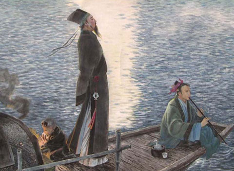 在前《赤壁赋》中,作者首先给我们描绘了一幅如诗的画面:月出东山,秋风习习,江面微波荡漾,横无际涯。在这里, 我们可以感受到作者从视觉到听觉、触觉的全面愉悦。所诵“明月之诗”、所歌“窈窕之章”也与眼前的自然美景相融相合。作者笔下的赤壁夜景清澈静谧,它没有尘世的喧嚣,没有人间的浮躁,一切都是那么纯净美好! 面对如此江山风月,作者顷刻间忘却了人间的烦恼、仕途的磨难,情不自禁地进入了一种飘飘欲仙的状态:“浩浩乎如冯虚御风,而不知其所止;飘飘乎如遗世独立,羽化而登仙。”遇美景而欢欣, 赏美景而忘情,自然之美因人而更甚,人因自然而又更加陶醉,于是游江赏景之人与赤壁的清澈静谧之景就融合为一了。