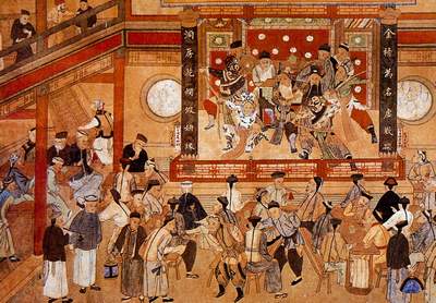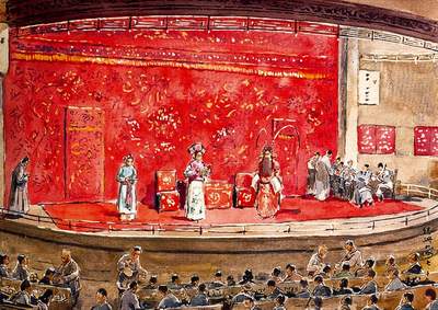 最初,人们是在“茶园”里听戏,光付“茶资”不买戏票,来此喝茶聊天解闷儿,观看演出纯属“顺带”。19 世纪中后期,随着京剧的兴盛,北京这种“茶园”剧场的数量大大增加。不同的演员、戏班子在不同的剧场里演出,演出的时间一般长达10 ~ 12 小时,不演夜场戏。“茶资”多少不是以戏论价,而是按座位论价。除供应茶水外,还提供付费的小吃(黑白瓜子、盐炒小花生等),也不是一入场就收费,而是到了压轴戏(倒数第二出戏)开演前后才收。1905 年前后,“茶园”剧场才逐渐由收茶资改为计“票价”。