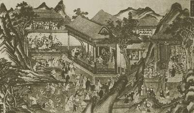 此图描画了晚清年间北京戏园演出之实况和园内实景,演出的同庆班在当时的北京很有名,台上的角色除一老生外,其余都是戴罗帽、穿英雄衣、系大绦带的短打武生。观众席上有老有少而无妇女,反映了当时禁止妇女入戏园看戏的社会风气。楼上左边有一外国衣装模样者,手指向舞台,似对舞台上的一切有所不解,十分有趣。(王树村藏)