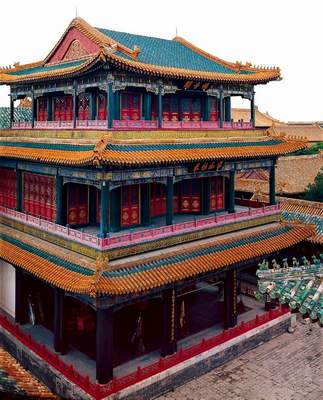 故宫畅音阁大戏台。每逢各种节日、皇帝登基和帝后的生日等重大庆典,皇亲国戚都要聚在宫中看戏。这个大戏台共分三层,后面有木楼梯把三层台连接起来。最下面的一层中央和四角有五口地井,可以根据剧情需要,把布景和人物从地下托上来;又有三口天井通达上面两层,演出神鬼戏时,用辘轳架把人物和布景从上面送下去,能造成从天而降的戏剧效果。帝后在戏台对面的阅是楼看戏。(张肇基摄)