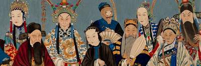 晚清著名画师沈容圃所绘《同光十三绝》戏装人物画像,长丈余,现藏于梅兰芳纪念馆。所画均为不同行当中具有代表性的表演艺术家,分别是程长庚饰《群英会》鲁肃(左六,老生行),卢胜奎饰《空城计》(或《战北原》)诸葛亮(右四,老生行),张胜奎饰《一捧雪》莫成(左二,老生行),杨月楼饰《四郎探母》杨延辉(右一,老生行),徐小香饰《群英会》周瑜(左七,小生行),谭鑫培饰《恶虎村》黄天霸(右二,武生行),梅巧玲饰《雁门关》(或《四郎探母》)萧太后(左三,旦行),朱莲芬饰《玉簪记· 琴挑》陈妙常(右三,旦行),时小福饰《桑园会》罗敷(右六,旦行),余紫云饰《彩楼记》王宝钏(左五,旦行),郝兰田饰《钓金龟》康氏(左一,老旦行),杨鸣玉饰《思志诚》闵天亮(右五,丑行),刘赶三饰《探亲家》乡下妈妈(左四,丑行)。画像中没有净角演员,虽不能完全代表同治(1862—1874)、光绪时期(1875-1908) 北京舞台上最杰出的演员,但作为京剧趋于成熟时期的图像资料,已弥足珍贵。