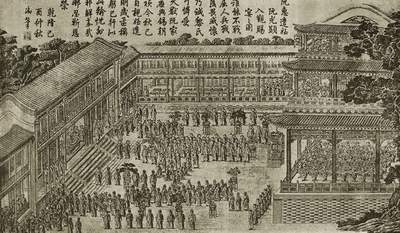 清乾隆年间皇家在避暑山庄福寿园清音楼观剧的盛大场面(梅兰芳纪念馆提供)