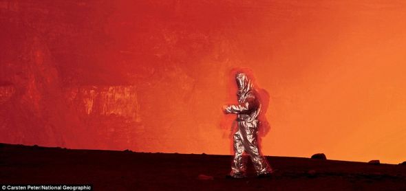 摄影师卡斯滕·彼得正在检测隔热服,他要借助它靠近熔岩湖。