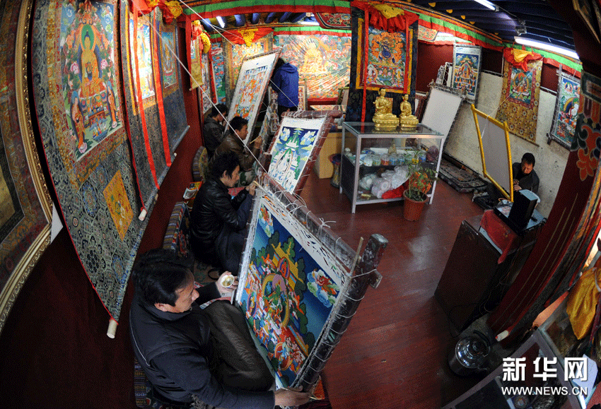 在西藏拉萨热闹的八廓北街上,有一家名为“八廓北街手工唐卡店”的唐卡画坊。据老板尼玛旺堆介绍,自己这家店是八廓北街最早开办起来的唐卡店,已经在此经营了12年,也见证了这条街的变迁和唐卡艺术的逐年发展壮大。