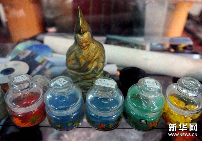 这是3月24日拍摄的唐卡颜料。传统的唐卡颜料全部采用金、银、珍珠、玛瑙、珊瑚、松石、孔雀石、朱砂等珍贵的矿物宝石和藏红花、大黄、蓝靛等植物颜料,用手工磨制而成。这些天然原料保证了所绘制的唐卡色泽鲜艳,即使经历几百年的岁月,仍是色泽艳丽明亮。