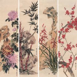 中国画中“四君子”是指的梅、兰、竹、菊,特别是花鸟画中,有相当多的作品是以它们为题村的。它们常被文人雅士用来表现清高拔俗的情趣:正直的气节、虚心的品质和纯洁的思想感情,因此,素有“君子”之称。