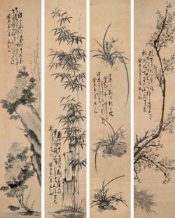 梅兰竹菊入画,丰富了中国画的题材,扩大了审美领域,它们不但本身富有形式美感,而且可以令人联想起人类的品格,所以它既便于文人们充分发挥笔墨情趣,又便于文人们借物寓意,抒发情感,因此,描写“四君子”之风至今不衰。