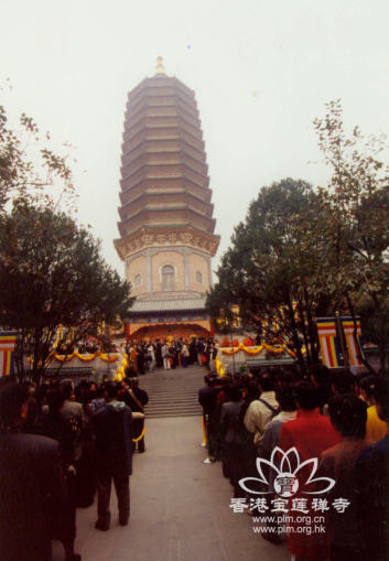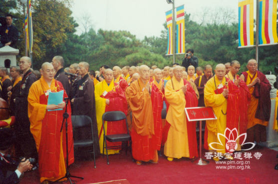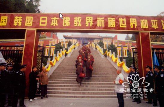 2001年10月27日 上午,中国、韩国、日本佛教界代表在北京灵光寺佛牙舍利塔下共同举行祈祷世界和平法会。法会由中国佛教协会副会长圣辉法师主持,三国代表分别诵经并宣读“和平祈祷文”。法会结束后,三国佛教代表还在灵光寺共同为中韩日三国佛教界举办的“僧侣镜头中的环保”摄影展剪彩揭幕。