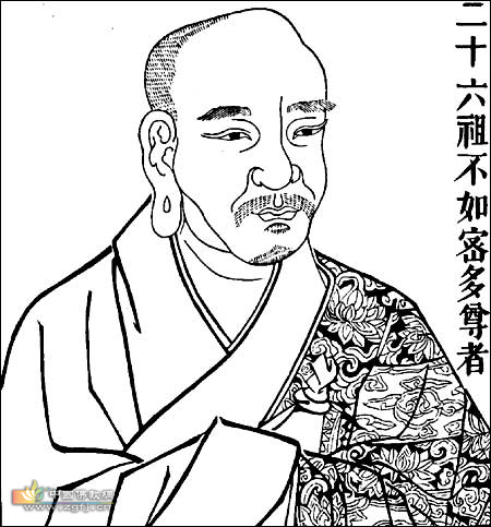 二十六祖不如密多尊者。南印度天德王之次子也。既受婆舍尊者法印。至东印度。彼王名坚固。奉外道师长爪梵志。及尊者将至。梵志预知祖入。恐王易志。即鸠诸弟子。欲以咒术挫之。尊者至直诣王所。王曰。师来何为。祖曰。将度众生。王曰。以何法度。祖曰。随类度之。梵志闻言。不胜其怒。即以幻法。化大山于祖顶上。祖指之。忽压彼众。梵志等怖惧投祖。祖愍其愚惑。再指之。化山随灭。乃为王演说法要。俾趣真乘。因谓王曰。此国当有圣人。而继于我。是时有婆罗门子。年二十许。幼失父母。不知名氏。或自言璎珞。故人谓之璎珞童子。游行闾里。丐求度日。后王与尊者同辇而出。见璎珞童子稽首于前。祖曰。汝忆往事否。童曰。我念远劫中。与师同居。师演摩诃般若。我转甚深修多罗。今日之事。盖契夙因。祖谓王曰。此童非他。即大势至菩萨是也。此童之后出二人。一化南印度。一人缘在震旦。遂以昔因故。名般若多罗。乃付大法眼藏。偈曰。真性心地藏。无头亦无尾。应缘而化物。方便呼为智。是为二十六祖。赞曰。从刹利种续传灯焰真嗣不明几乎失陷从闹市中忽闻故人函盖相合乃得其真。